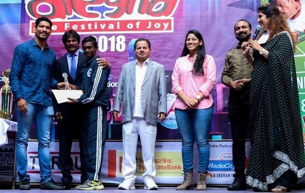 Ms. Pooja Shankar Jagtap is receiving the award from International Kabaddi player Rishank Devadiga